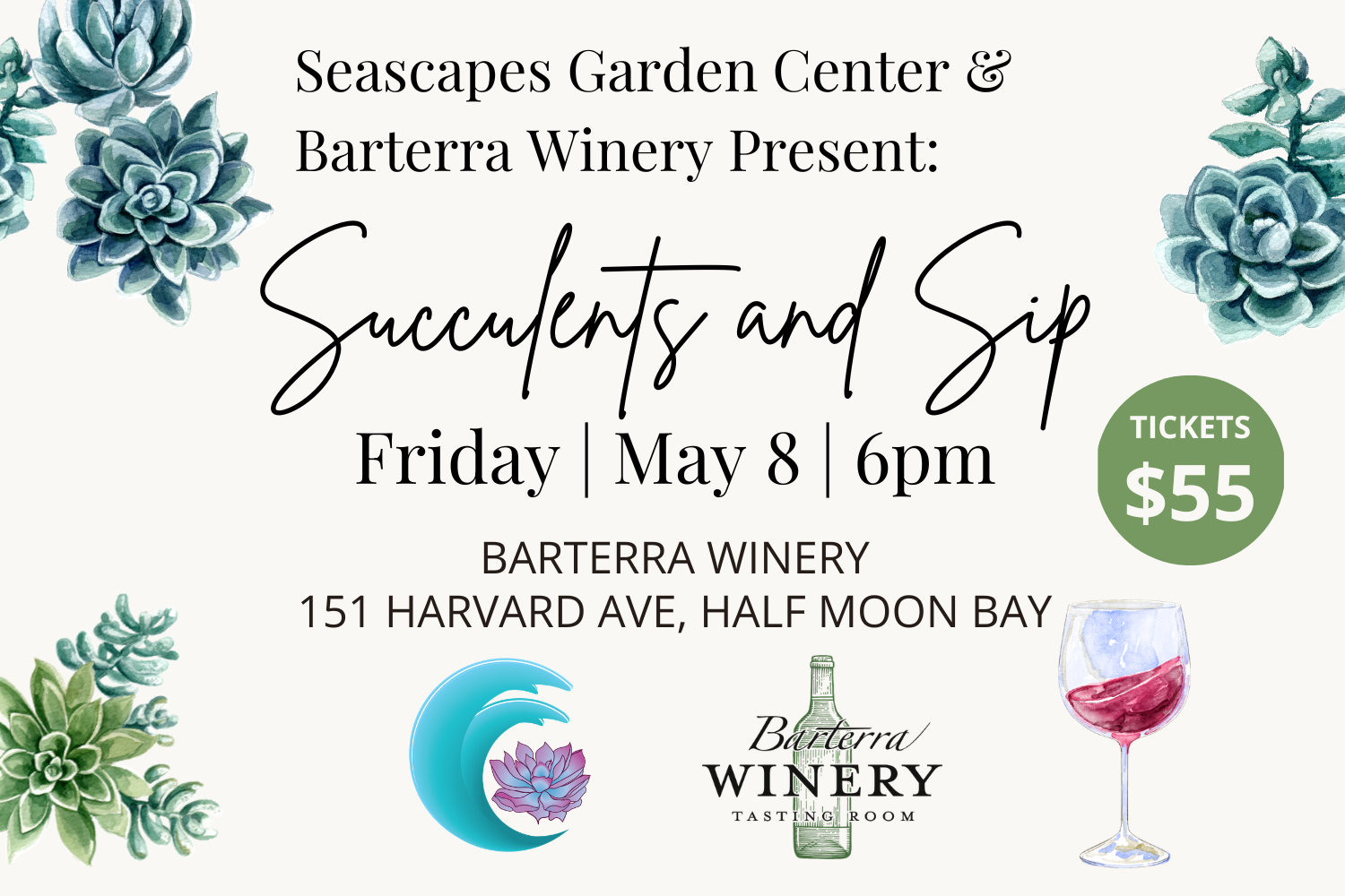 Join us on Friday, May 8 at 6 pm with UC Master Gardener Janice Moody from Seascapes Garden Center for a lesson on Succulent arranging while sipping on a glass of Barterra Winery’s Award-winning Wine!