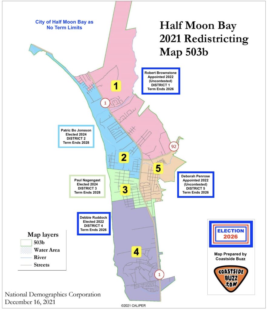 The City of Half Moon Bay holds district-based elections for its five city council seats. Each Councilmember is elected to a 4 year term. There are no term limits in Half Moon Bay. The City Council selects one of its members to serve as Mayor and one to serve as Vice Mayor, on an annual basis.