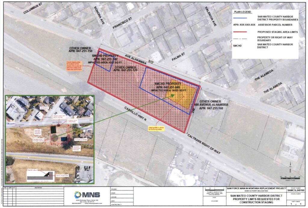 The Sewer Authority Mid-Coastside (SAM) is a Joint Powers Authority, which provides wastewater treatment for the local area. The District Admin Office and the District’s Pillar Point Harbor properties are customers of SAM. SAM is currently working on a force main sewage pipe replacement project and is requesting use of District property for equipment, vehicle and trailer storage on the above described parcel.”