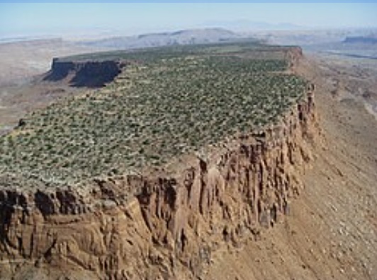 2) Rock crust over softer ground, like the mesas of the Southwest. The crust protects the softer rock directly under from erosion, but outside that umbrella soft stuff wears off quickly.