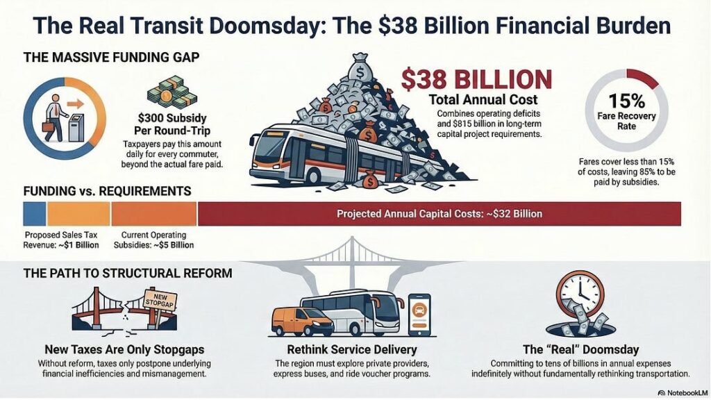 The true “Transit Doomsday” is not temporary transit service reductions. It is committing the region to tens of billions of dollars in annual transit expenses indefinitely, without fundamentally rethinking how transportation services are delivered and managed, and whether water, sewer, wildfire, schools, or other needs have higher priority.