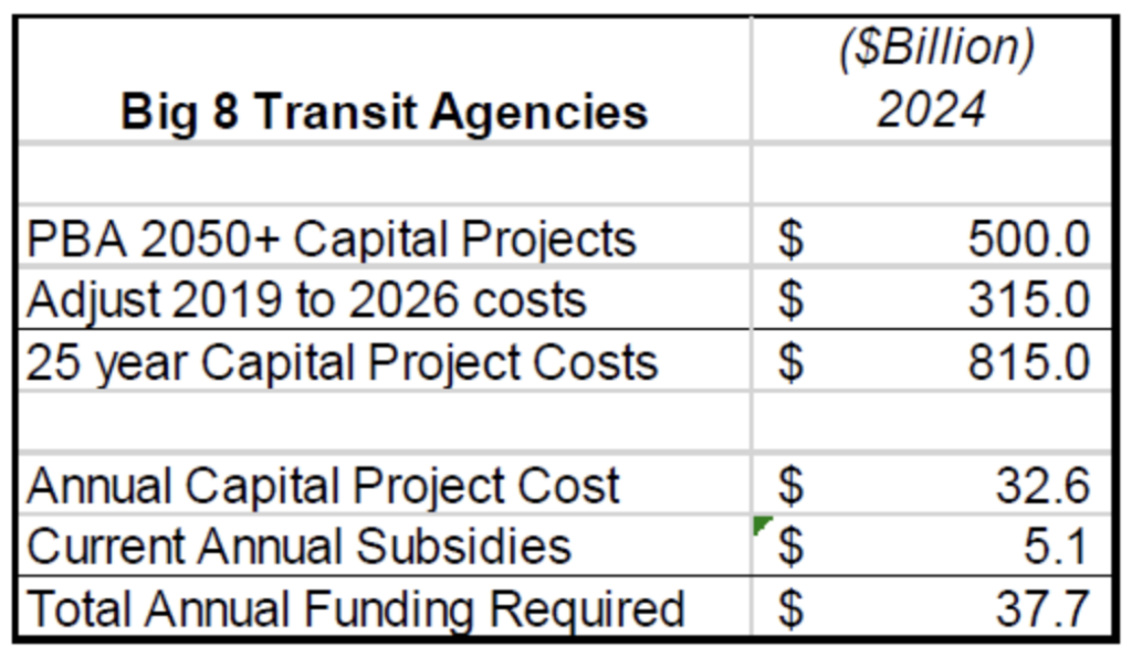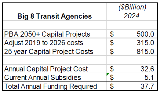 – reported combined subsidies of approximately $5 billion from federal, state, and local sources – including capital contributions. In other words, transit in its current form survives only through massive and ongoing public support. And those subsidies are unlikely to continue given the current Federal Administration and the State’s projected deficits.